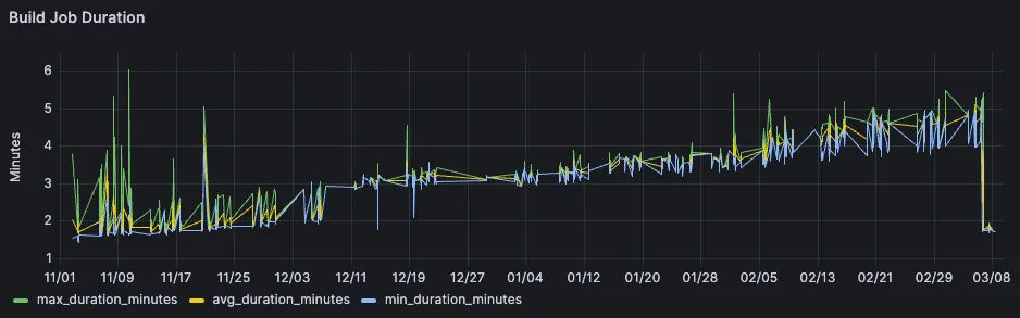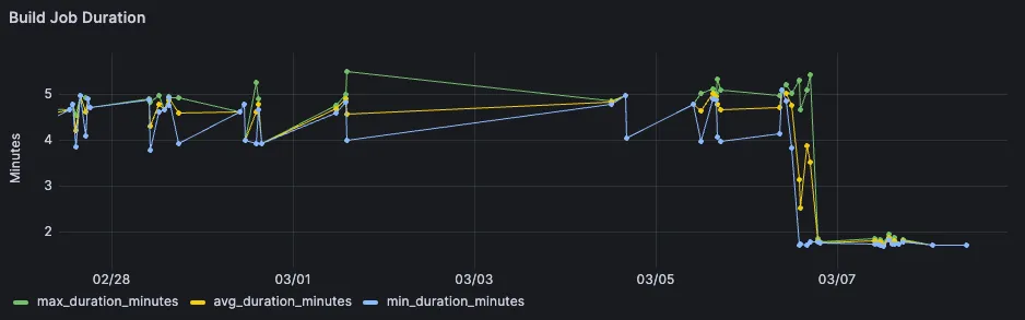 Looking at the overall pipeline speed is more tricky. This is because pipeline looks different based on the branch, but also based on the amount of manual jobs which get triggered. Despite that, we could still see the observed savings in the displayed graph on the very right.