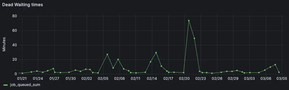 We could also finally see the total amount of job queue times. It is the amount of time a GitLab CI/CD job has to wait, before it gets picked up by a runner.
